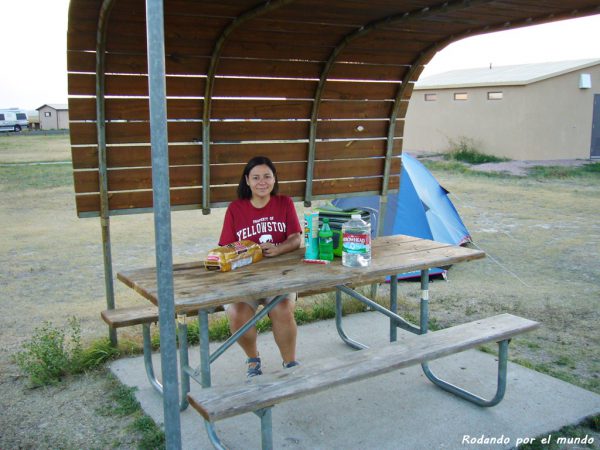 Durante nuestra visita a Badlands National Park nos quedamos a pasar una noche en este camping. Situado dentro del parque nacional, nos costó 20 dólares. Aquí está prohibido hacer fuego por el riesgo de incendio, así que no hay parrillas. Sí que hay mesa de picnic, que está debajo de un pequeño techo que sirve de protección frente al calor que hace aquí en verano.