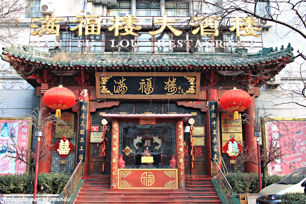 Al salir del parque nos dirigimos hacia Dianmen Dajie. En esta calle se encuentra el restaurante donde vamos a ir a comer hoy: el Man Fu Lou Restaurant.